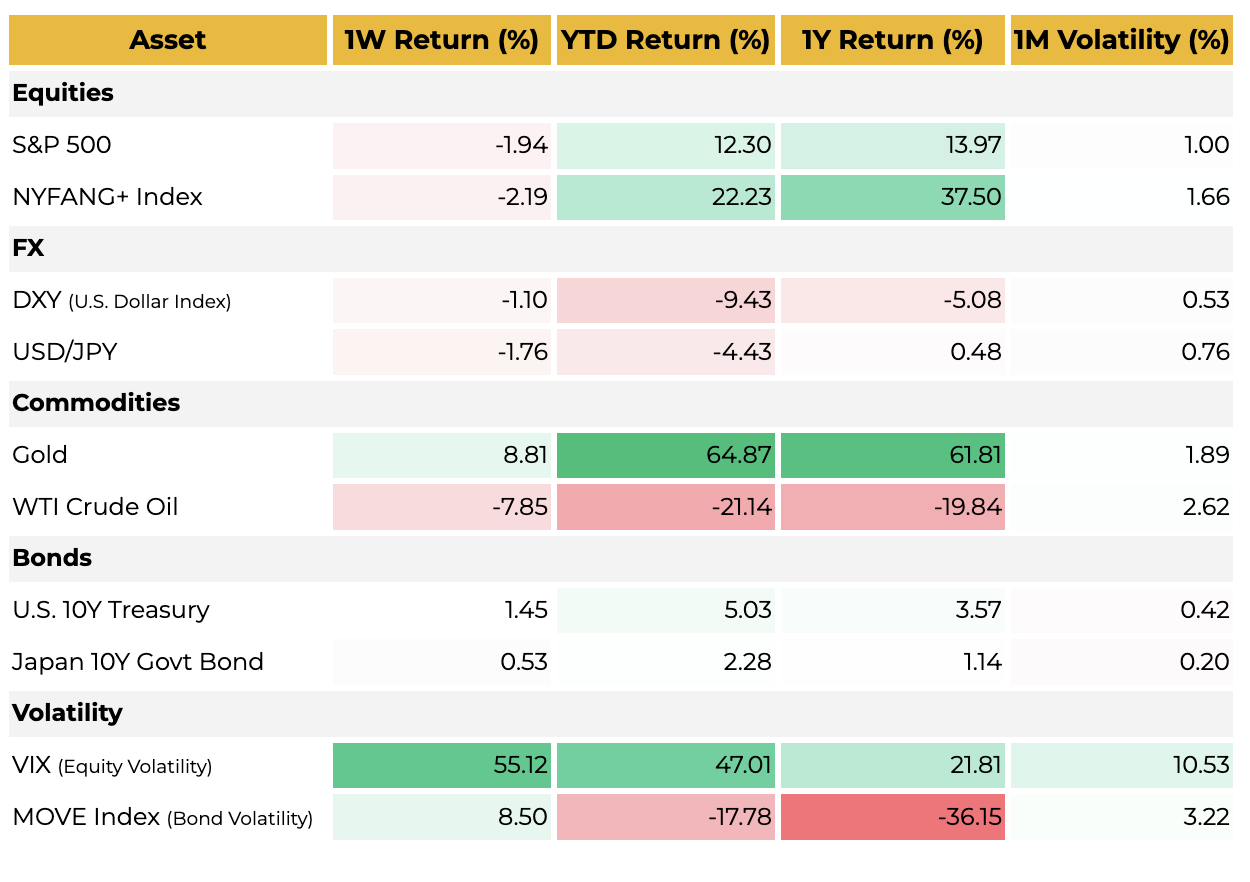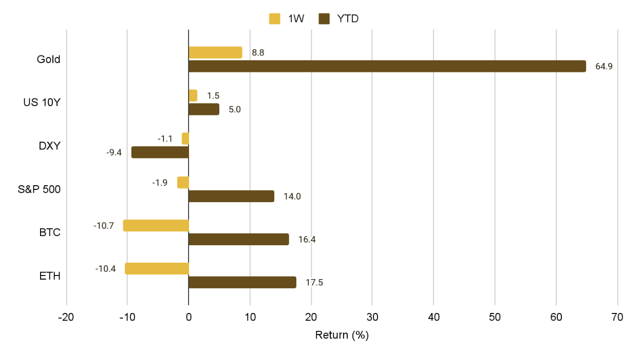 금은 거시 불확실성 헤지 자산의 역할을 수행하며 주간 +5% 상승했습니다. S&P 500은 저점에서 반등해 주간 -0.8%로 마감했습니다. 반면 비트코인과 이더리움은 강한 반등에 실패하며 각각 약 -10% 하락으로 주간을 마쳤습니다.