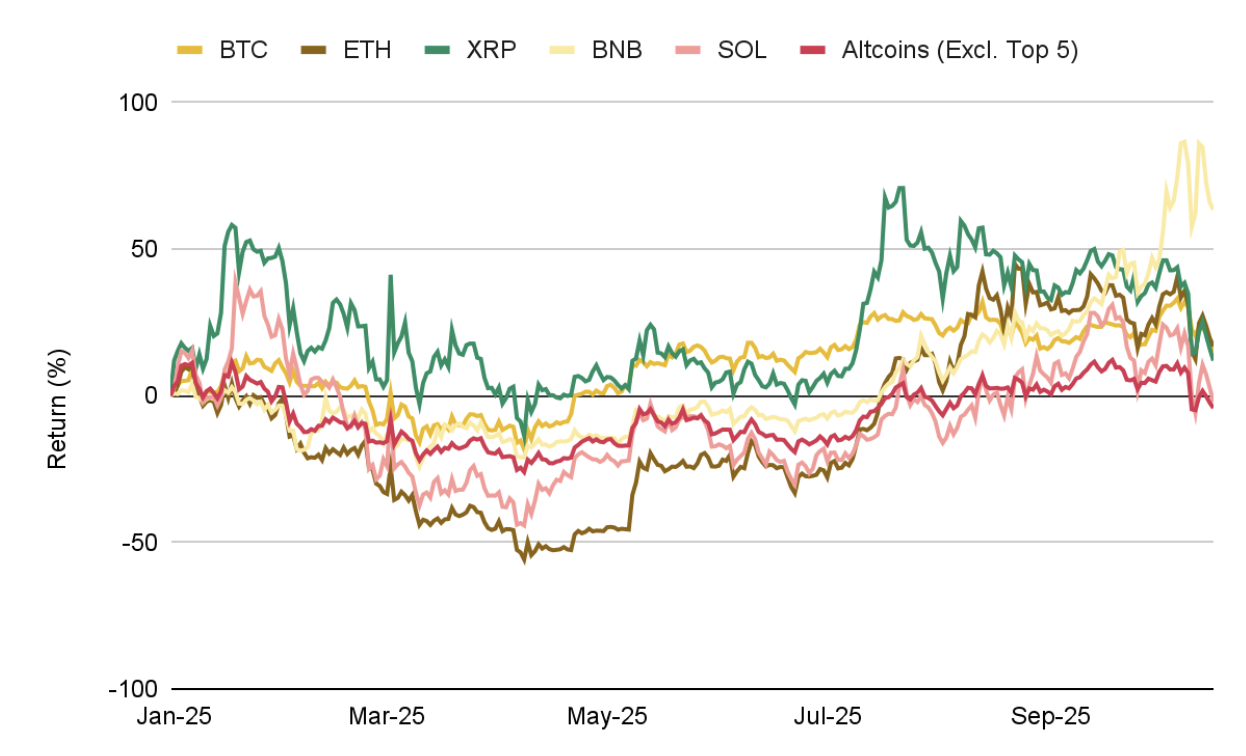 무역전쟁 재점화에 대한 실망 매도와 10일 발생한 대규모 청산이 겹치며 주요 자산 전반이 약세를 보였습니다. 비트코인은 직전 주에 기록한 사상 최고가 약 12.6만 달러에서 약 -14% 하락해, 집필 시점 기준 저점 약 10.4만 달러까지 밀렸습니다.