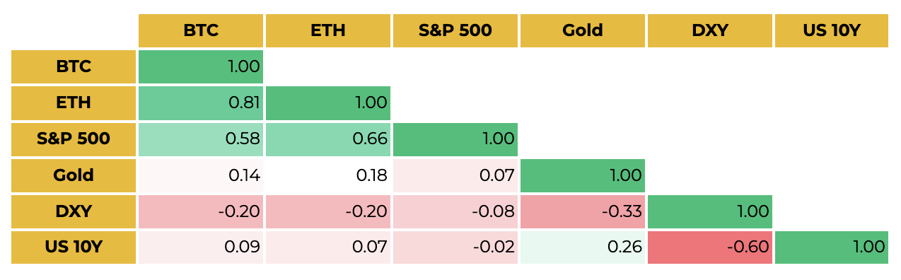 이번 주 비트코인 하락으로 금과의 2개월 상관계수는 0.31 → 0.23으로 하락했습니다. 올해 들어 중앙은행 매수·실질금리 하락에 힘입어 연초대비 약 +65% 급등한 금은 ‘디지털 금’으로 불리는 비트코인에 시장 주도권을 쉽게 내주지 않고 있습니다.