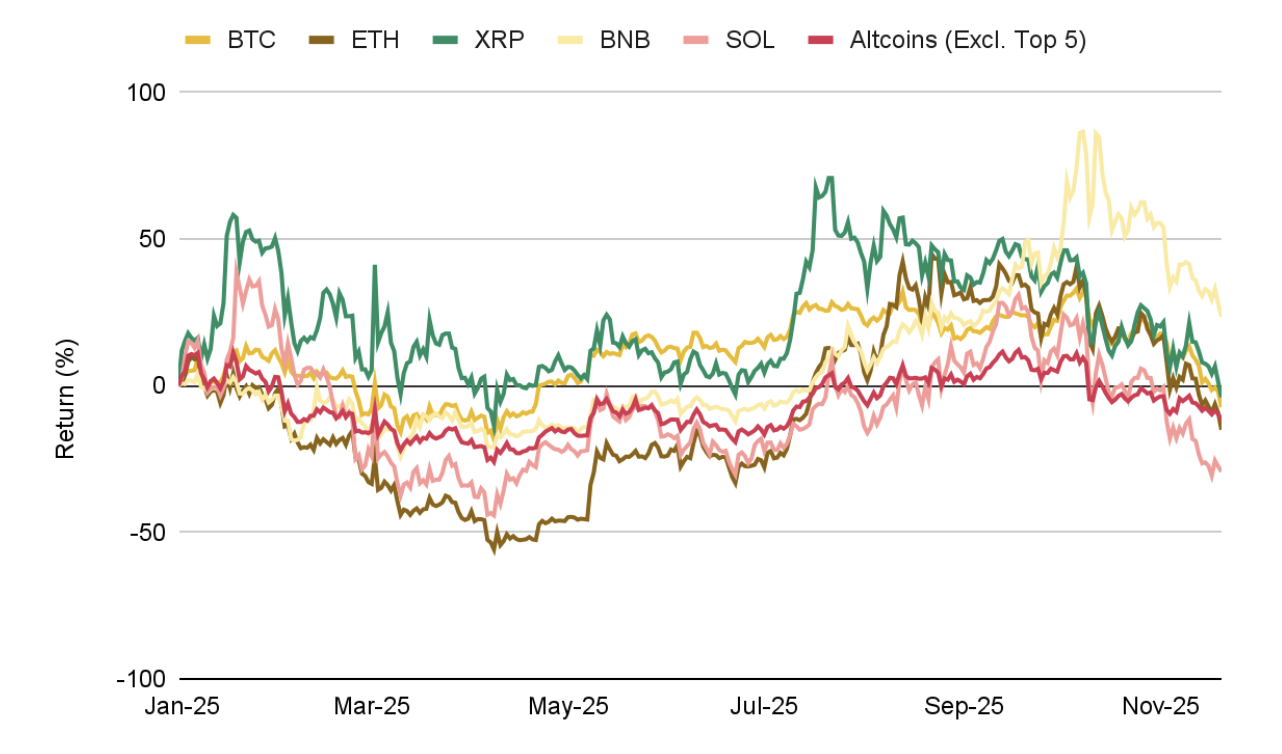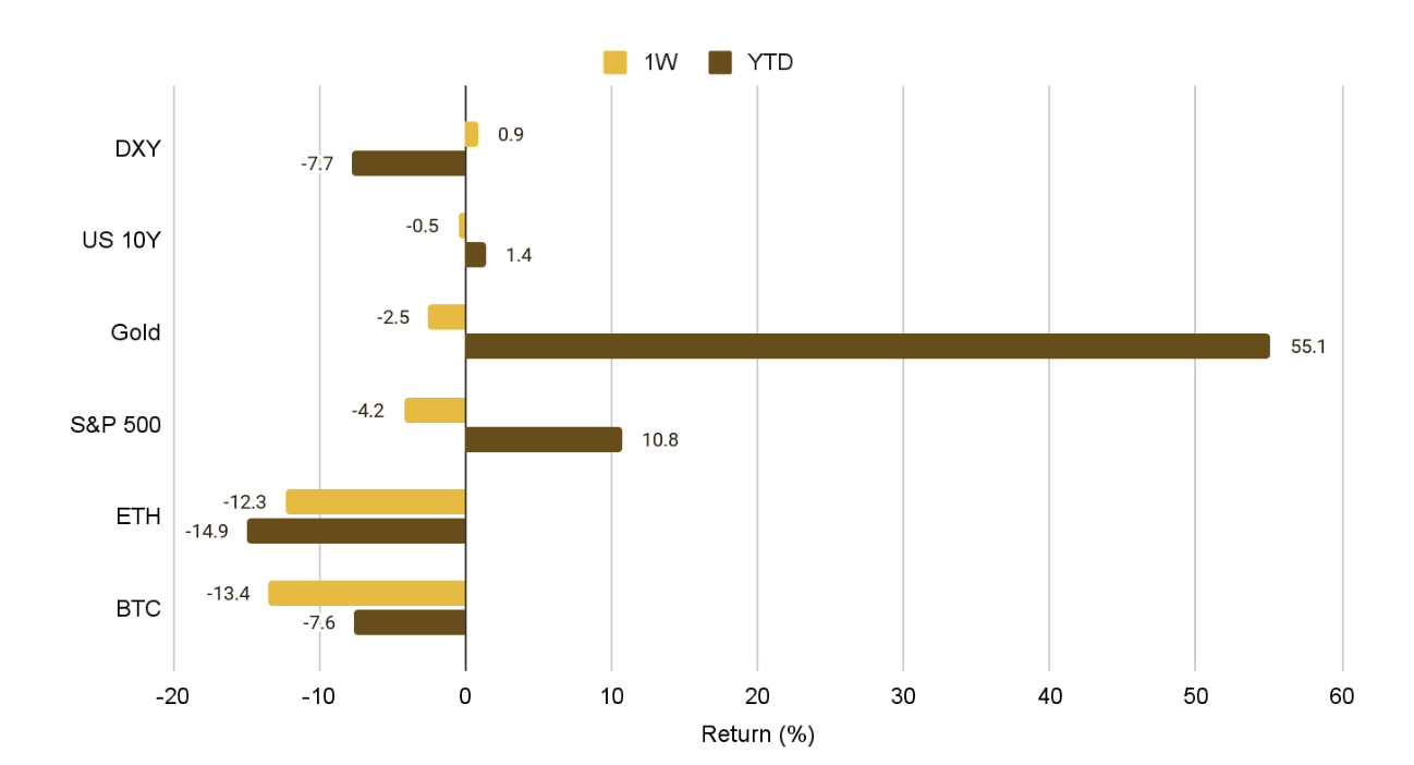 시장이 상당한 불확실성에 직면하면서 자산 가격은 전반적으로 하락했습니다. 엔비디아의 어닝 서프라이즈와 구글의 제미나이 3 출시로 인한 AI 주도 상승세에도 불구하고 S&P 지수는 하락했습니다. 금은 지난 몇 주간의 역사적인 랠리 이후 열기가 식었습니다. 비트코인과 이더리움은 특유의 높은 변동성을 보이며 각각 9%, 11% 큰 폭으로 하락했는데, 이는 투자자들이 엇갈린 거시경제 데이터에 직면하여 전반적으로 차익 실현에 나선 것으로 보입니다.