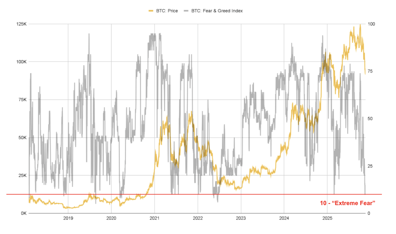 시장의 심리가 역대 최저 수준에 도달함에 따라, 우리가 이미 사이클 고점에 도달했을 수 있다는 우려가 가상자산 시장 전반에 퍼지고 있습니다. 비트코인 공포 & 탐욕 지수는 11월 15일 10을 터치했으며, 이는 2025년 2월 이후 최저치입니다.