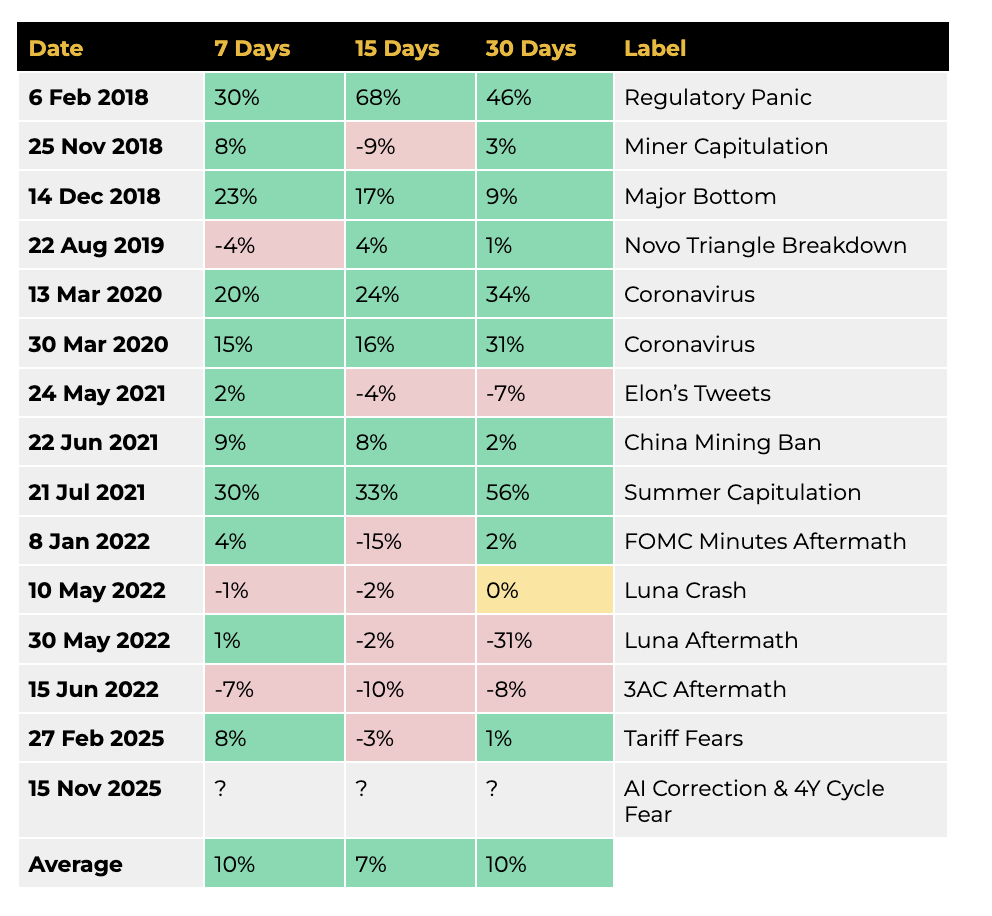 이 지수가 10 이하로 떨어졌던 과거 15번의 주요 사례 이후 비트코인 가격 성과를 분석해보면, 평균적으로 비트코인은 향후 7일 및 30일 기간 동안 10%의 수익률을, 향후 15일 동안은 7%의 수익률을 기록했습니다. (출처: @krugermacro)