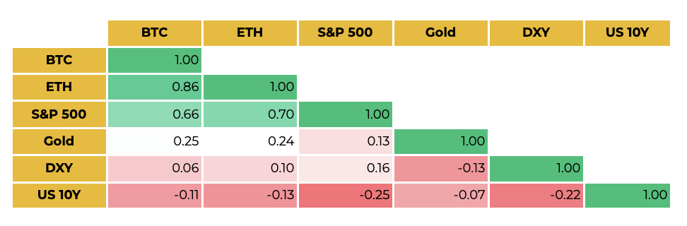 지난주와 비교해 상관관계 수치에는 미미한 변화만 있었습니다. 3개 자산이 모두 하락하면서 금과 BTC, ETH의 상관관계가 소폭 상승했습니다.