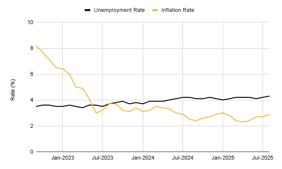 경제 상황은 복합적인 모습을 보이고 있습니다. 기술주와 S&P는 사상 최고치 바로 아래를 맴돌고 있지만, 실업률은 상승 추세이며 인플레이션은 연준의 목표치인 2%보다 1%포인트 높은 약 3% 수준에서 끈질기게 유지되고 있습니다.