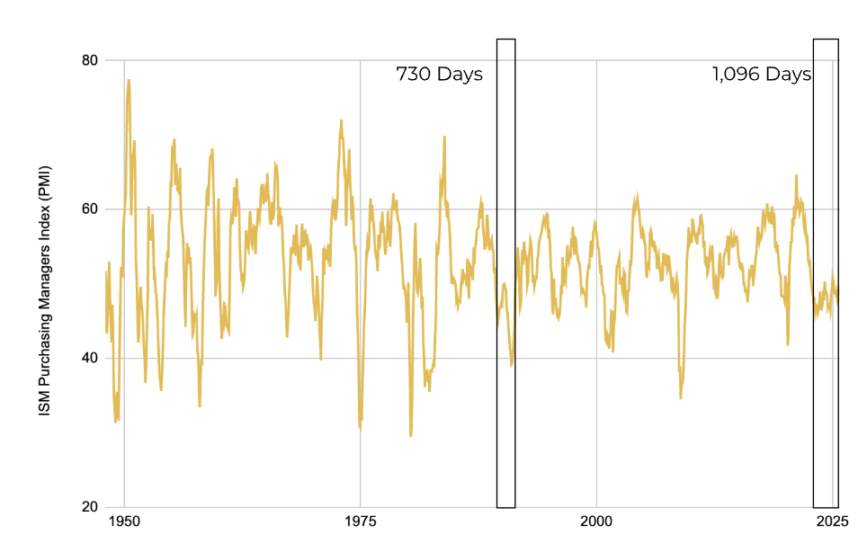 이 모든 상황 속에서 ISM 구매관리자지수(PMI)는 미국 경기 사이클이 아직 확장 국면에 진입하지 못했음을 시사합니다. PMI는 2022년 11월 이후 50 임계값 아래에 머물러 있으며, 이는 해당 지수 역사상 가장 긴 침체기입니다. 이전 최장 기록은 1989년 5월부터 1991년 5월까지 약 2년이었습니다.