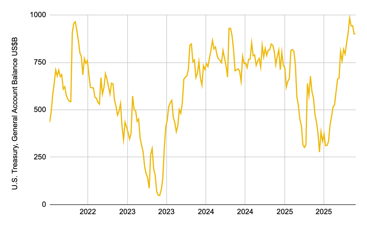 - 이번 주 월요일부터 연준의 월 400억 달러 규모 유동성 주입 효과가 재개되었습니다. 지난주 추수감사절로 인해 둔화되었던 재무부 일반 계정(TGA) 지출 가속화와 맞물려, 지난 3주간 순감소액은 430억 달러에 불과했습니다. 향후 2주 동안 약 1,000억 달러 규모의 추가적인 감소 여력이 있을 것으로 예상됩니다.