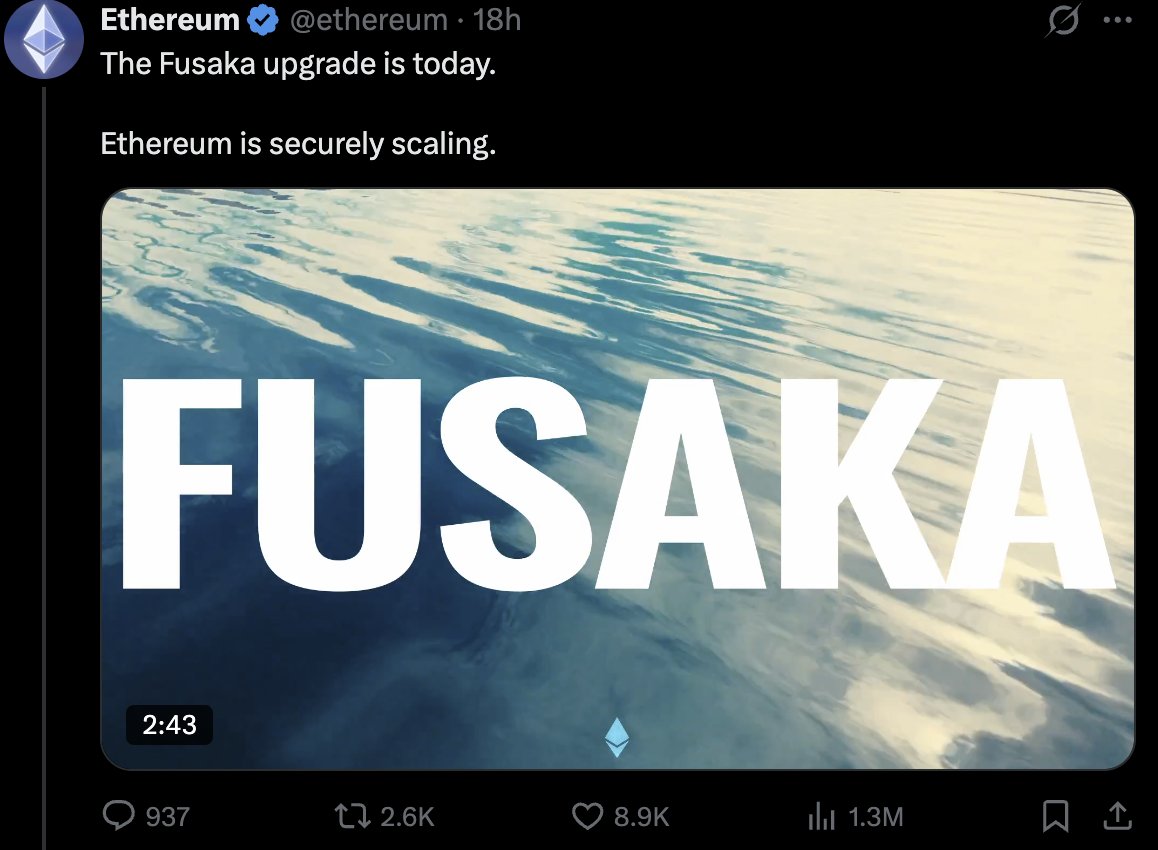ETH, 또 하나의 이정표 달성 이더리움은 주로 Fusaka 업그레이드 활성화에 힘입어 비트코인 수익률을 크게 상회하며 최고 3,240달러를 기록했습니다. Peer DAS(피어 데이터 가용성 샘플링) 도입을 통해 노드의 하드웨어 부담을 늘리지 않으면서 이론적으로 레이어 2 데이터 용량을 8배 증가시켰습니다.