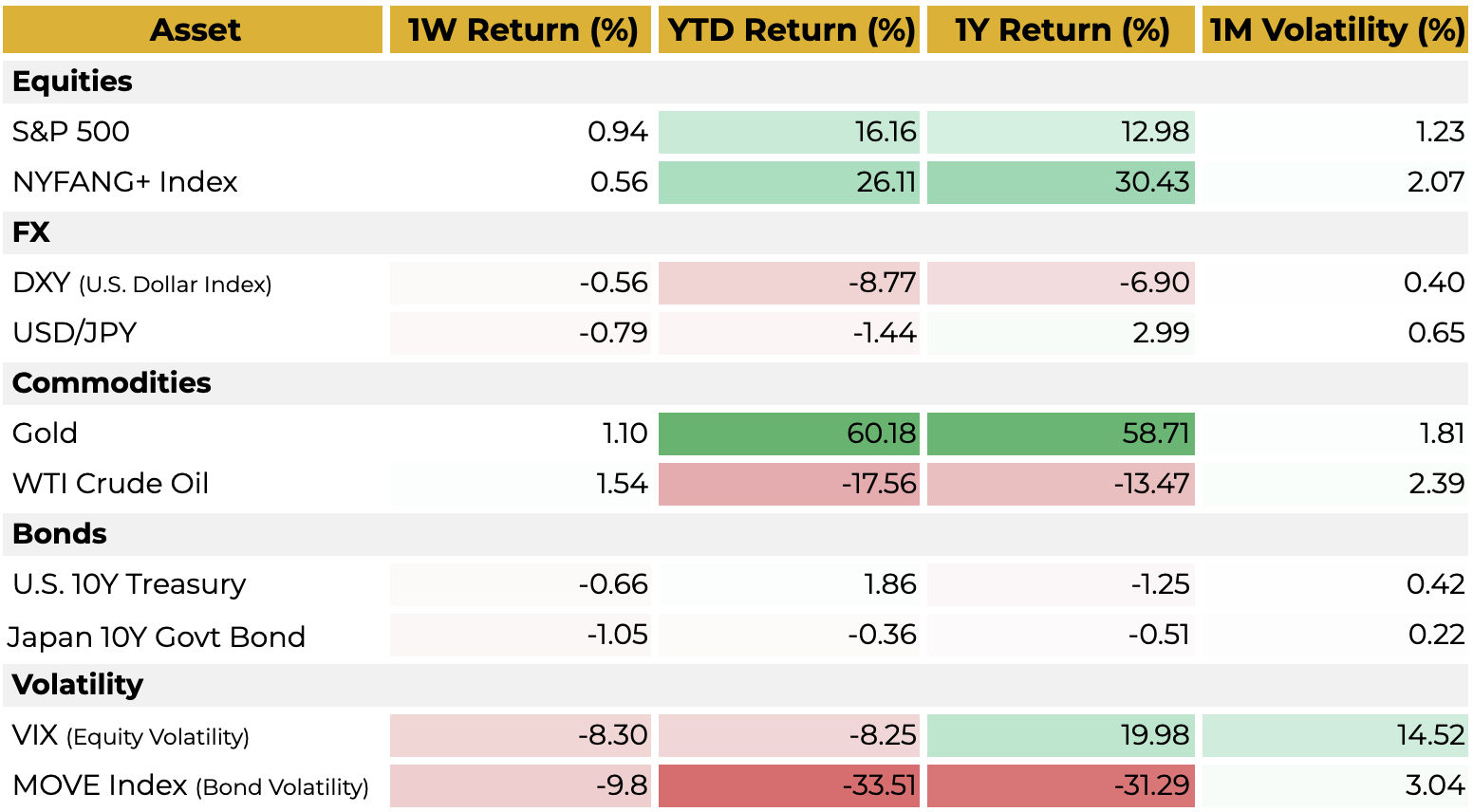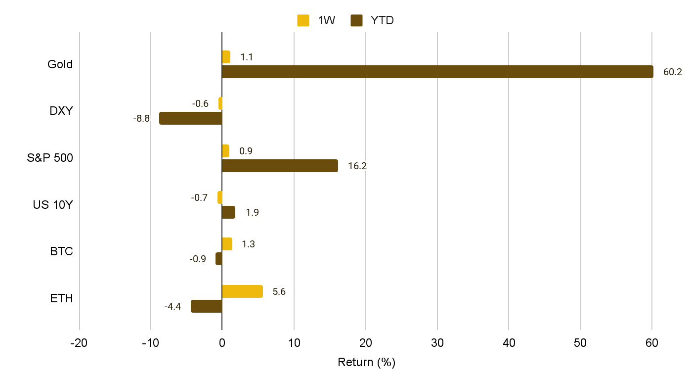 결과적으로 비트코인은 1.3% 상승 마감했으며, 이더리움은 최신 효율성 업그레이드에 힘입어 5.6% 급등했습니다. 한편, 미 달러화는 소폭 하락했고 미국 주가지수는 완만한 반등세를 이어갔으며, 시장 변동성은 2주 연속 감소했습니다.