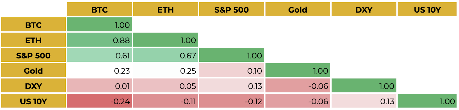 이번 주 가상자산 자산과 주식 시장 간의 상관관계는 약 60%로 비교적 높게 유지된 반면, 금과의 상관관계는 더욱 하락했습니다.