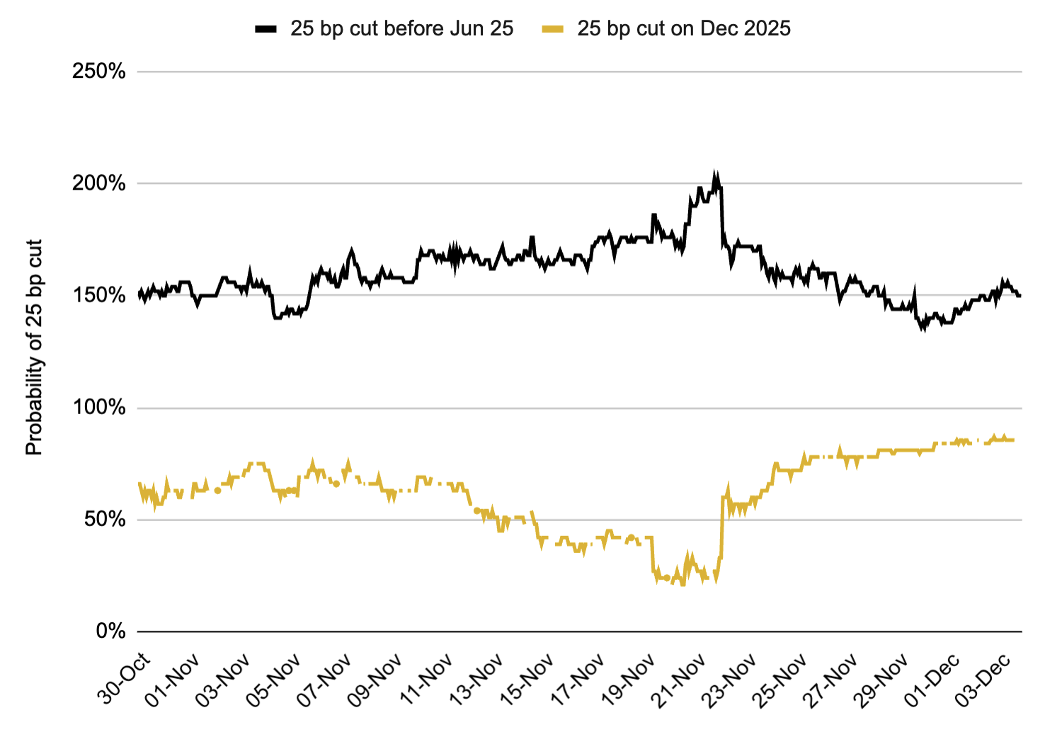 12월 인하 확실시, 주목받는 2026년 금리 경로 최근 12월 금리 인하 기대감이 되살아났지만, 이는 내년 상반기 금리 인하 기대감을 낮추는 대가로 이루어진 것이어서 향후 12개월 전체 금리 전망은 크게 변하지 않았습니다. 지난달 대부분의 연준 위원들이 매파적 견해를 표명했음을 감안할 때, 12월 10일 FOMC의 금리 인하는 매파적 발언을 동반할 가능성이 높습니다. 10월 인하 때와 마찬가지로 파월 의장은 시장 기대를 관리하고 금리 인하가 인플레이션 기대를 자극하지 않도록 신중한 어휘를 사용할 것으로 예상됩니다.