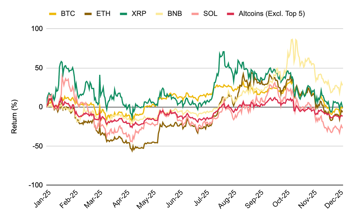 - 주식: 지수 레벨에서 시장은 S&P 500과 나스닥이 소폭 상승하며 비교적 차분했으나, 내부적으로는 상당한 섹터 로테이션(순환매)이 있었습니다. 이번 주의 두드러진 특징은 러셀 2000(소형주)이 기술 섹터보다 우수한 성과를 보였다는 점입니다. 펀더멘털이 약하고 공매도 잔고가 높은 주식들이 시장 전반보다 더 많이 올랐습니다. 메타(Meta)는 메타버스 지출 삭감으로 급등한 반면(가상자산에는 좋은 소식이 아닐 수 있음), 엔비디아는 수출 제한 우려(H200/Blackwell 금지 리스크)로 인해 나스닥의 상승폭을 제한했습니다.