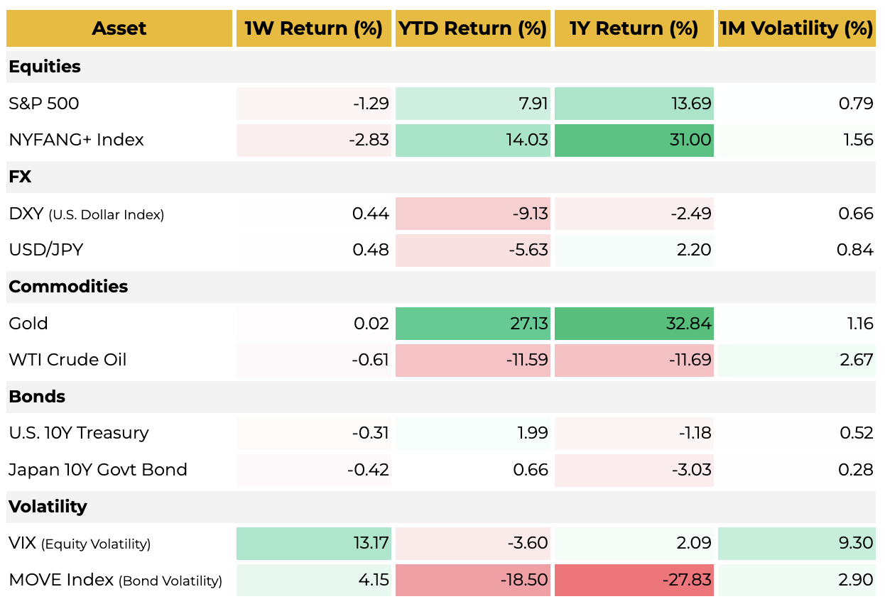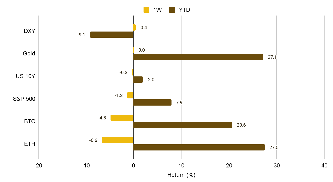 이번 주 위험자산 전반이 조정을 받는 가운데, 달러지수(DXY), 금, 미 10년물 금리는 비교적 보합권을 유지했습니다. 크립토 자산의 하락폭이 가장 컸고, BTC는 −4.8%, ETH는 −6.6%로 최근 랠리의 일부를 반납했습니다.