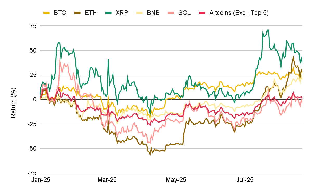 이번 주 디지털 자산은 전반적으로 조정을 받았고, BTC·ETH·XRP 등 주요 자산이 하락을 주도했습니다. 반면 BNB는 2025년 들어 처음으로 YTD 기준 BTC를 아웃퍼폼하며 사상 최고가를 경신, 구조적 강세를 재확인했습니다. 상위 5종 외 알트코인 묶음은 상대적으로 낙폭이 작았지만, 세부 섹터별로는 차별화가 컸습니다. 스테이블코인, 거래소 토큰, 레이어1, 디파이는 상대적으로 선방했고, 밈코인·게이밍·AI는 부진했습니다.