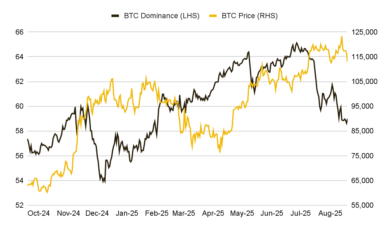 이러한 변화는 BTC 도미넌스에 반영되었습니다. 이번 주 BTC 도미넌스는 58.6%의 저점을 기록하며 알트코인 선호가 강화되었음을 보여줍니다. 특히 올해 초와 달리, 최근 BTC의 사상 최고가 경신은 도미넌스 하락과 8월 ETF 순유출과 맞물렸습니다. 이는 기관 채택이 확대되는 가운데서도, 수요의 상당 부분이 리테일 활동에 의해 견인되고 있음을 시사합니다.