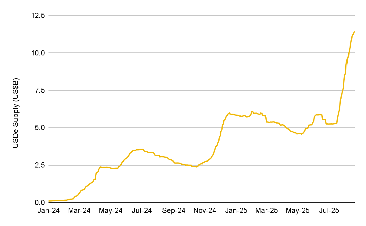 - Ethena의 USDe는 공급이 1개월 새 86.7% 증가하며 116억 달러에 도달, 사상 최단기간에 100억 달러를 돌파한 스테이블코인이 되었습니다. Ethena는 수익(primitives)에서 더 넓은 정산 레이어로 진화 중이며, TON 등 다중 네트워크 통합과 함께 수수료 스위치, 바이백, 인센티브 프로그램 등을 도입하고 있습니다. 글로벌 금리가 역사적 저점 대비 여전히 높은 환경에서, 이자 발생형 스테이블코인은 2,750억 달러+ 규모 시장에서 견고한 해자를 구축하고 있습니다.