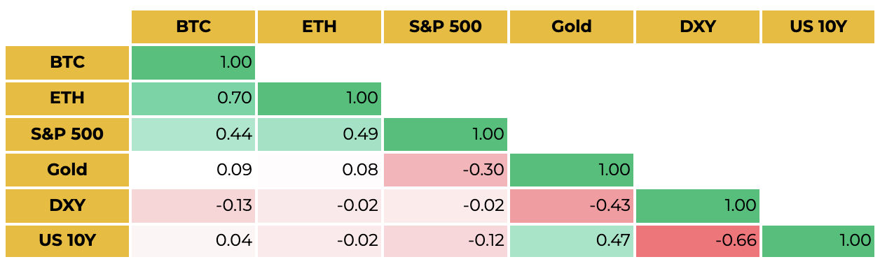이번 주 BTC의 위험자산 상관관계가 강화되었습니다. ETH와의 상관계수는 0.70, S&P 500과는 0.44를 기록했습니다. 흥미롭게도 금과의 상관관계가 −0.02에서 0.09로 소폭 플러스로 전환했습니다. S&P 500이 여전히 금과 비교적 강한 음(-)의 상관관계를 보이는 점을 고려하면, 이는 멀티에셋 포트폴리오 내에서 BTC의 잠재적 분산효과를 부각시킵니다.