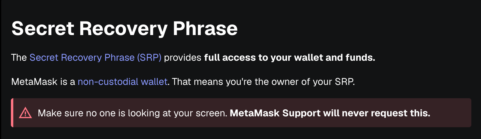 지갑을 설정하고 자금을 조달하기 전에 이해해야 할 중요한 개념이 하나 있습니다. 메타마스크는 비수탁형 지갑이라는 것입니다. 즉, 오직 본인만이 비밀 복구 구문(SRP, 시드 구문이라고도 함)을 보유하게 됩니다. 메타마스크는 이 구문의 복사본을 가지고 있지 않으며 사용자를 위해 복구해 줄 수 없습니다.