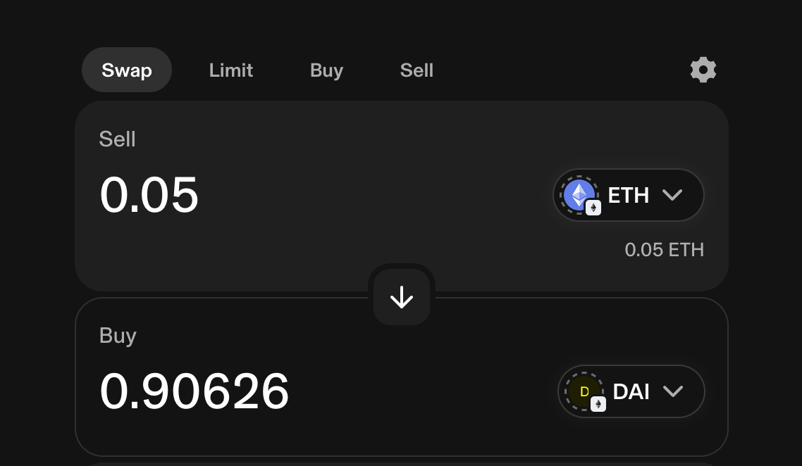 이 예제에서는 테스트넷 ETH를 DAI로 스왑합니다. DAI는 스테이블코인 역할을 하는 ERC-20 토큰입니다. 테스트넷에서 이러한 토큰은 실제 가치가 없다는 점을 명심하세요.