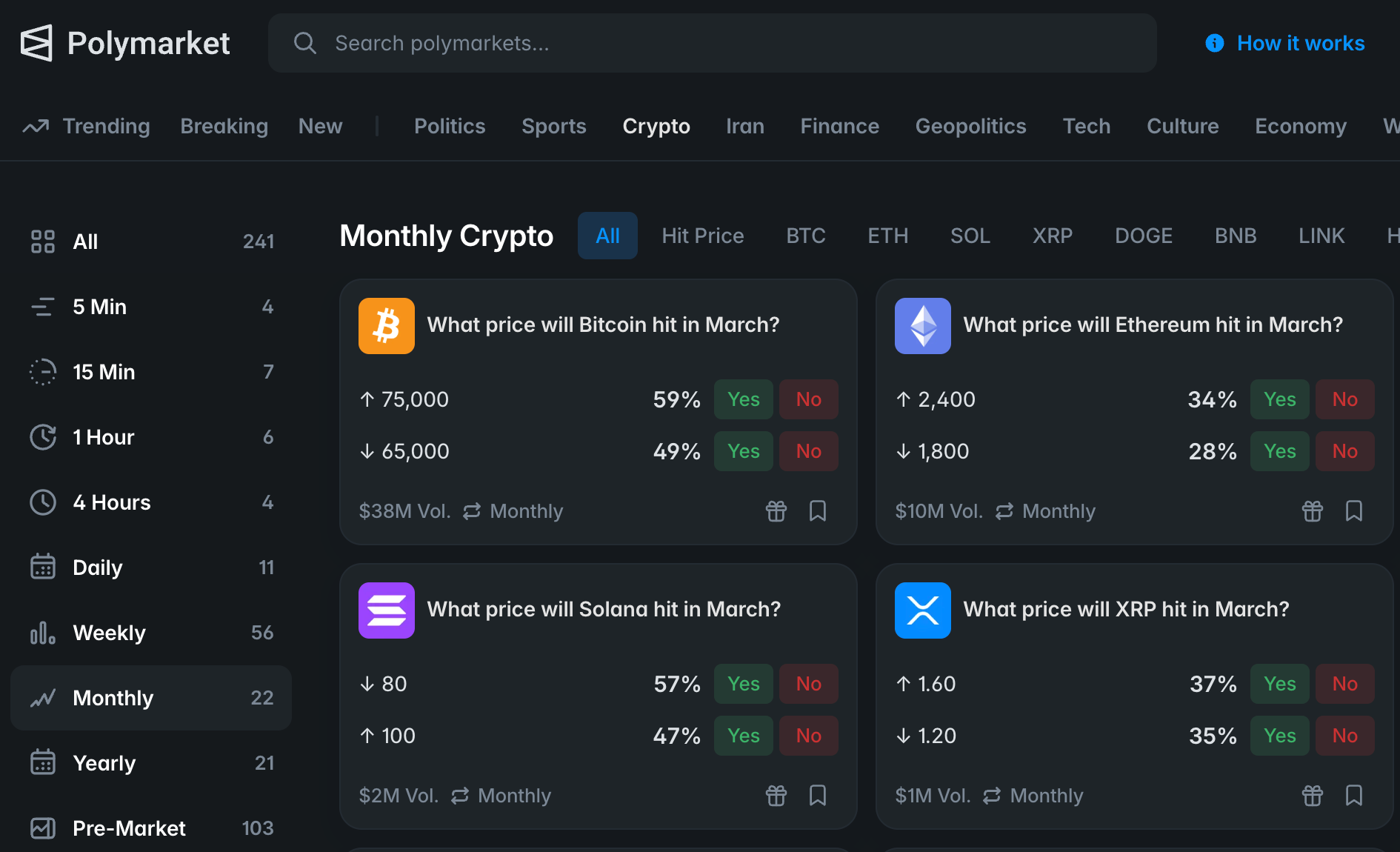 5분부터 1년에 이르기까지 다양한 결의 시간에 기반한 시장을 탐색할 수 있습니다. 특히 5분~15분 단위의 짧은 시장은 결과가 빨리 나와 흥미로울 수 있지만, 가격이 매우 빠르게 변동하므로 각별히 주의해야 합니다.
