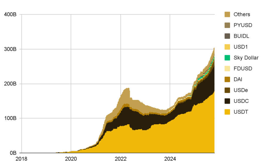 이러한 빠른 채택 흐름에 맞추어, 전체 스테이블코인 시가총액은 2020년 이후 가파르게 증가해 2025년 10월에 3,000억 달러를 돌파했습니다.
