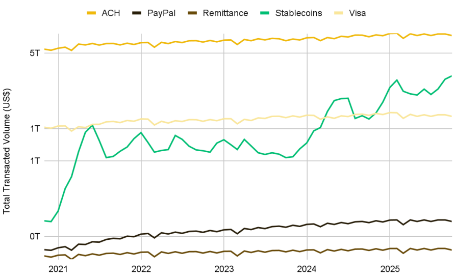 거래량 측면에서, 비정상적 거래를 제외해 조정한 기준으로 보면 스테이블코인은 2024년에 이미 결제 대기업 비자의 거래 규모를 확실하게 넘어섰고, 현재는 미국 자동이체결제 시스템(ACH, Automated Clearing House)의 일평균 약 7.3조 달러에 이어, 약 3.1조 달러 수준으로 두 번째로 큰 일평균 결제 매체가 되었습니다.