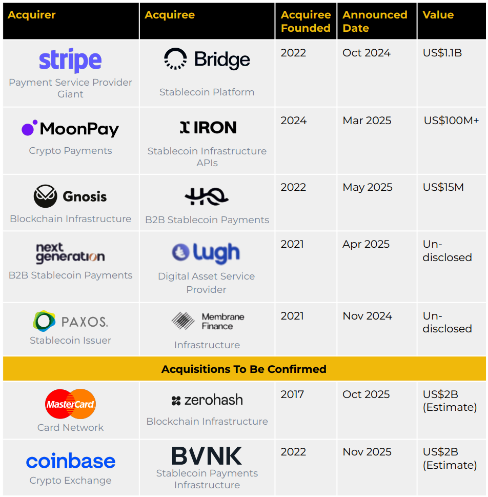 오늘날에는 웹3와 웹2 기업 모두가, 특히 디지털 결제와 국경 간 송금·결제 영역에서 스테이블코인의 막대한 잠재력을 빠르게 인식하고 있습니다. 지난 2년 동안 스테이블코인 결제 버티컬에서 여러 건의 대형 인수 사례가 등장했습니다.