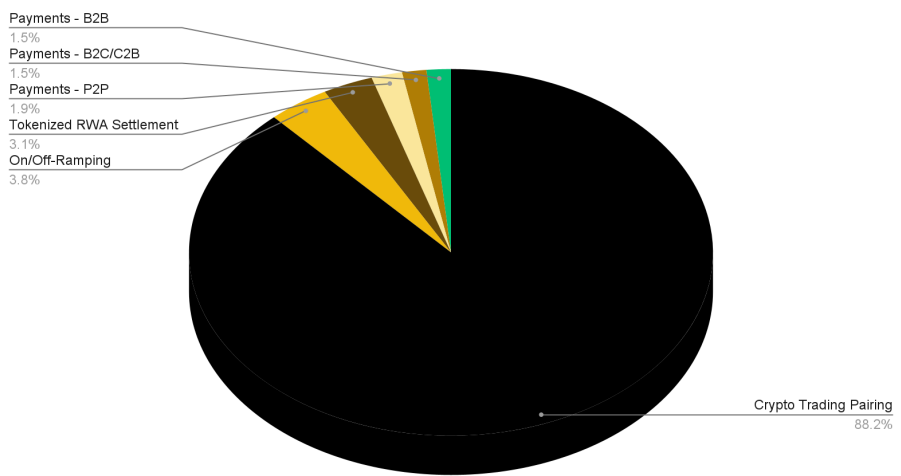 트레이딩은 스테이블코인의 가장 크고 중요한 사용 사례로 남아 있습니다. 그러나 트레이딩은 스테이블코인 잠재력의 빙산의 일각에 불과합니다. 디지털 네이티브이자 프로그래머블하며 24/7로 운영 가능한 국경 없는 화폐라는 특성을 고려하면, 스테이블코인은 트레이딩·신용·결제·저축 등 광범위한 금융 상품·비즈니스·기능성을 포괄하는 새로운 금융 인프라의 게이트웨이가 될 수 있습니다. 최근 데이터와 트렌드를 고려하면, 다음으로 주목해야 할 영역은 결제일 가능성이 높습니다.