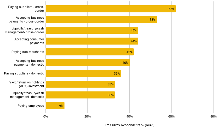 2025년 9월, 언스트앤영(Ernst & Young)이 실시한 설문조사에 따르면, 응답 기업의 62%는 공급업체에 대한 국경 간 결제 수단으로 스테이블코인을 사용해본 경험이 있으며, 53%는 국경 간 사업자 결제 수납 수단으로 스테이블코인을 사용한 바 있다고 답했습니다.