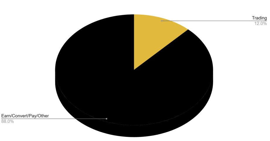 이러한 스테이블코인 효용의 전환은 이미 사용자 행동에서 관찰되고 있습니다. 전 세계 거래량 기준 최대 거래소인 바이낸스의 데이터를 보면, 월간 활성 사용자 중 실제로 트레이딩에 참여하는 비율은 약 12%에 불과합니다. 나머지 88%는 Earn(저축/수익), Pay(결제), Convert(법정화폐-크립토 변환) 등, 비투기적 유틸리티 기능을 이용하고 있습니다.