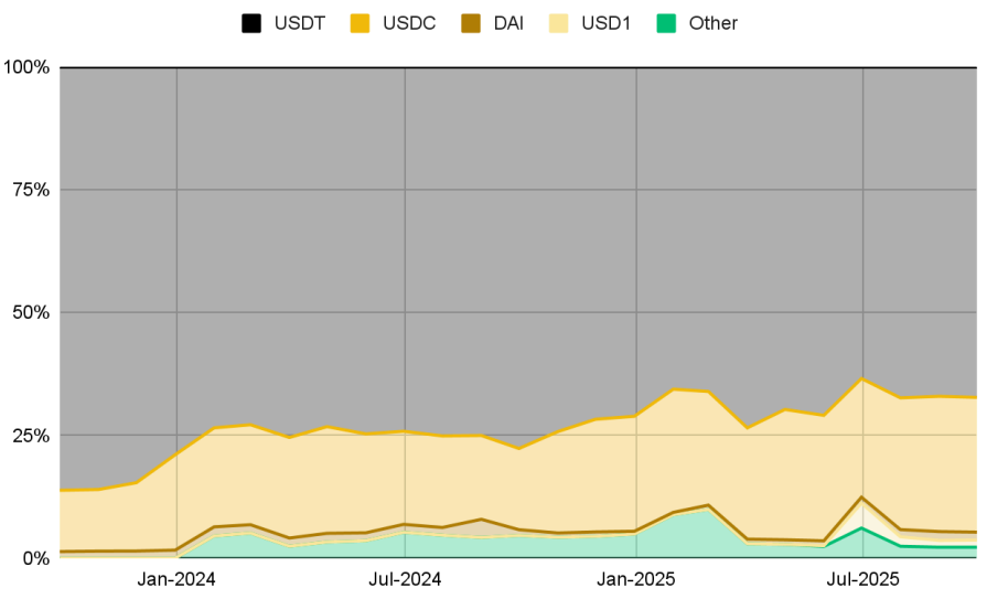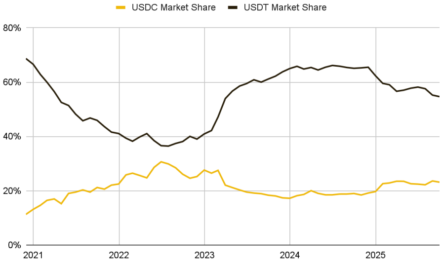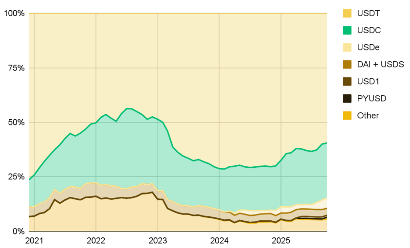 테더는 전체 스테이블코인 발행량과 글로벌 유동성 측면에서 확고한 선점 지위를 유지하고 있지만, 이 내러티브는 표면 아래에서 점차 변하고 있습니다. 최근 몇 년간 USDC는 구조적 성장을 기록하며, 2020년 11월 약 11%였던 시장 점유율을 2025년 11월 기준 약 23%까지 두 배 이상 끌어올렸습니다.