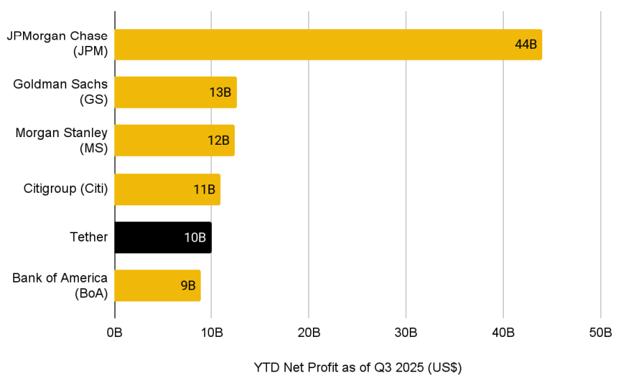 USDT 발행사 테더는 스테이블코인 시가총액과 온체인 활동뿐 아니라 기업 수익성에서도 선두에 서 있습니다. 1,800억 달러가 넘는 USDT 유통량에서 발생하는 이자 수익을 기반으로, 테더는 2025년 3분기 기준 연초 이후 100억 달러 규모의 이익을 기록하며, 전 세계에서 가장 수익성이 높은 기업 중 하나로 성장했습니다.