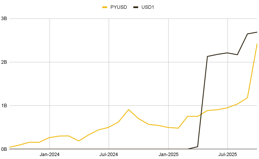 페이팔(PayPal)은 2023년에 스테이블코인 PYUSD를 출시했고, 트럼프 가문이 후원하는 월드 리버티 파이낸셜(World Liberty Financial)은 2025년 3월 USD1 스테이블코인을 출시했습니다. 두 코인 모두 2025년 한 해 동안 시가총액 10억 달러를 돌파하는 의미 있는 성장을 기록했습니다.