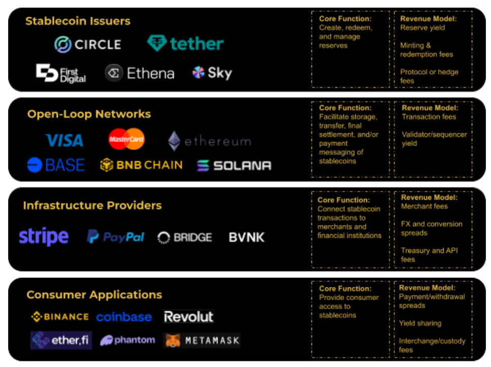b. 탈중앙 수익형 자산 담보형(Decentralized Yield-Bearing Asset-backed): USDe, USDS 등으로 대표되며, 디지털 자산 또는 기타 이자수익 자산을 주요 담보로 삼습니다. - 스테이블코인 스택을 둘러싼 전쟁: 주요 플레이어들은 스테이블코인 가치사슬의 더 많은 층을 소유하려는 레이스를 벌이고 있습니다. 단순 발행을 넘어, 발행(Issuance), 네트워크(Networks), 인프라(Infra Providers), 소비자 애플리케이션(Consumer Applications) 등 여러 레이어를 동시에 장악하려는 움직임이 나타나고 있습니다.