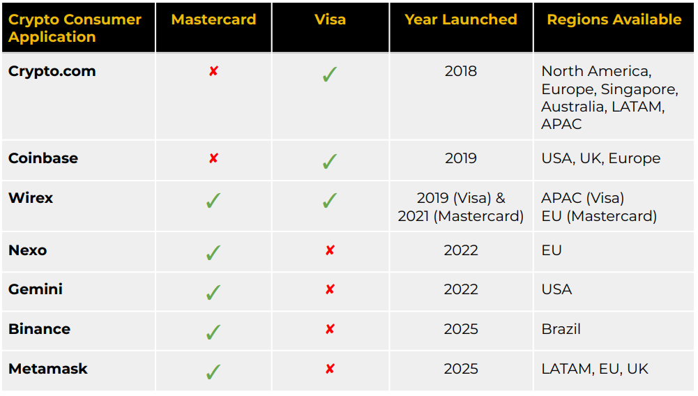 그럼에도 불구하고, 기존 카드 네트워크는 여전히 분명한 우위를 갖고 있습니다. 수십억 장의 카드와 수억 개의 가맹점으로 구성된 비자·마스터카드의 글로벌 네트워크는, 스테이블코인 기반 소비자 애플리케이션이 온·오프램프를 확보하는 데 있어 여전히 필수적인 인프라입니다.