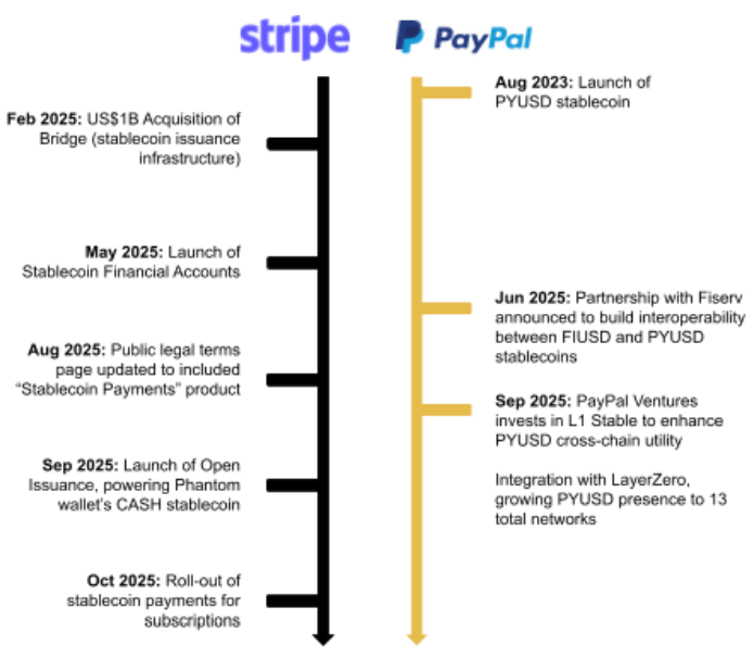스테이블코인과 퍼블릭 블록체인 레일은, 기존 카드 네트워크와 은행 중개자를 대체할 수 있는 더 저렴하고 효율적인 대안이 될 잠재력을 갖고 있습니다. 이러한 가능성을 인식한 스트라이프와 페이팔은, 적극적으로 스테이블코인 정산 및 발행 기능을 인프라에 통합하고 있습니다. 이 전략은 PSP가 각 거래에서 유지할 수 있는 수수료 몫을 크게 확대할 수 있다는 점에서 매력적입니다.