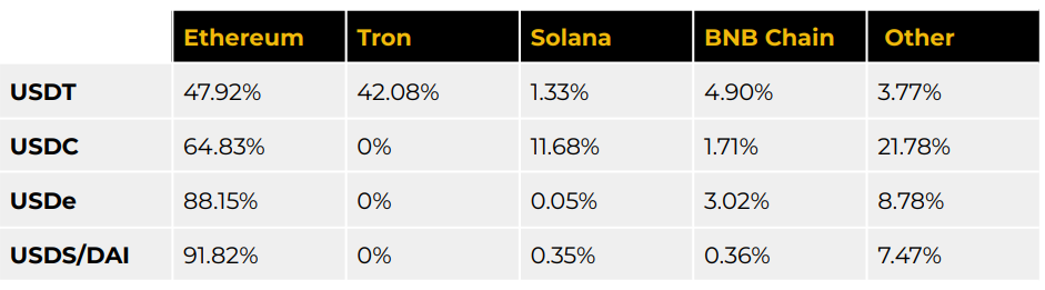 이더리움은 여전히 약 55.2%로 스테이블코인 유통의 주된 체인이지만, 업계 전반의 트렌드는 더 많은 단편화 쪽으로 움직이고 있습니다. 이는 리테일 결제에 적합한 더 저렴하고 빠른 트랜잭션을 위한 필요성에 의해 주도되며, 고성능 체인으로의 마이그레이션과 템포·Plasma·Arc와 같은 스테이블코인 특화 L1의 출현을 촉발하고 있습니다.