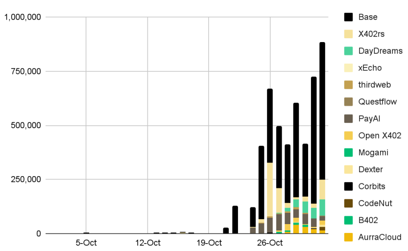 5월 소규모 출시 이후, x402 사용량은 2025년 3~4분기에 폭발적으로 증가해, 일일 거래량 75만 건, 주간 370만 건을 넘어섰습니다. 현재 x402는 Base, BNB Chain, Solana 전반에서 사용되고 있으며, HTTP 기반 민팅(HTTP mints)을 지원하는 다양한 토큰 출시가 프로토콜의 확장성을 테스트하고 개발자 관심을 끌어올렸습니다.