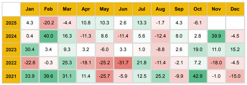 - TRX -12.5%, DOGE -21.1%로 10월에 알트 전반에서 투기 포지션 축소가 나타났습니다.