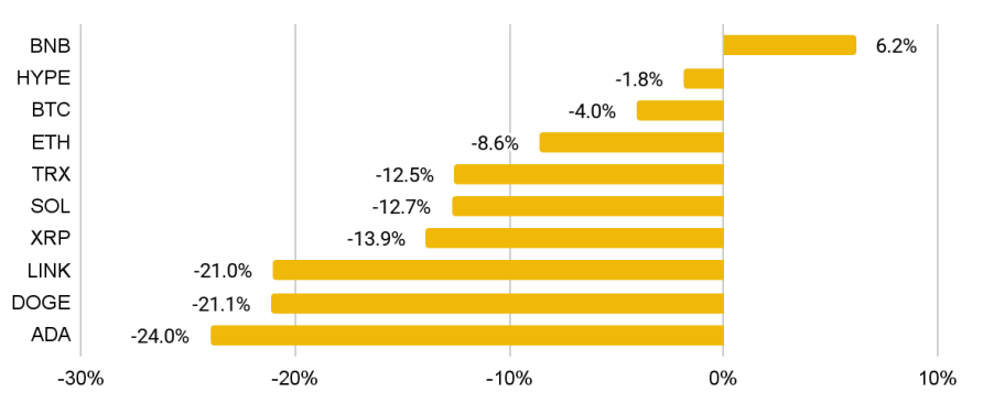- XRP는 -13.9% 하락했습니다. 매도 압력이 커졌고 정부 셧다운으로 현물 ETF가 지연된 점이 부담이었습니다.
