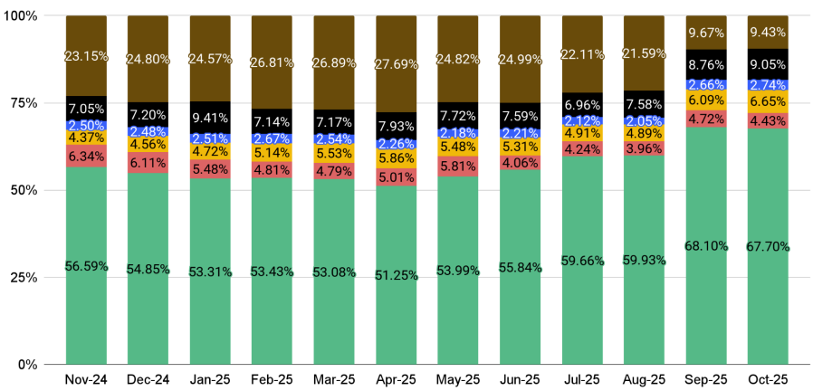 10월 전체 크립토 시가총액은 6.1% 감소하여 2018년 이후 처음으로 10월에 하락을 기록했습니다. 이는 시장 내 과도한 레버리지 해소 과정에서 10월 10일 190억 달러를 넘는 강제청산이 발생한 데 따른 큰 폭의 조정이었습니다. 미국 정부 셧다운은 월 초에 시작되어 여전히 진행 중으로, 핵심 경제 지표에 대한 가시성이 제한되며 투자자 불확실성이 커졌습니다. 연준은 시장 예상대로 10월에 25bp 인하를 단행했지만, 파월 의장은 연내 추가 인하에 회의적 입장을 내비쳤습니다. 반면 일본은행(BOJ) 은 금리를 동결하며 인플레이션이 통제되고 성장이 유지되고 있음을 시사했습니다.