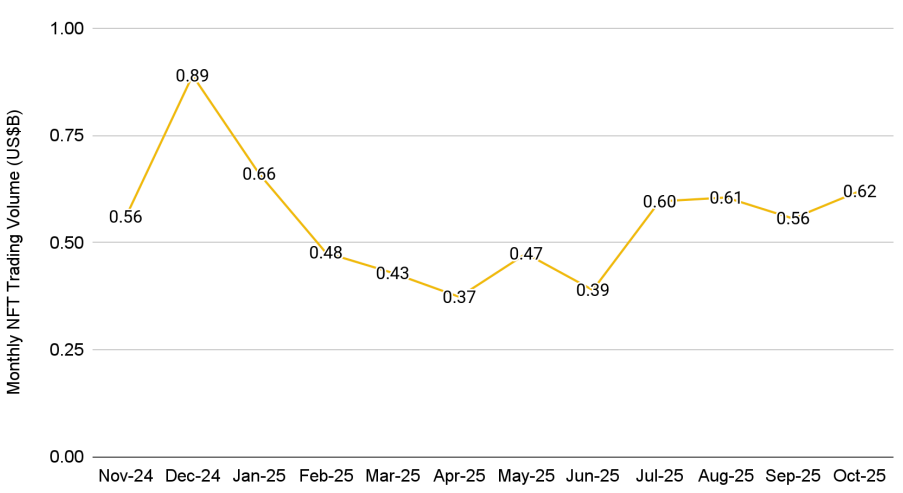 2025년 10월 NFT 총 판매대금은 11.5% 증가하며 이전 몇 달의 수준을 유지했습니다.