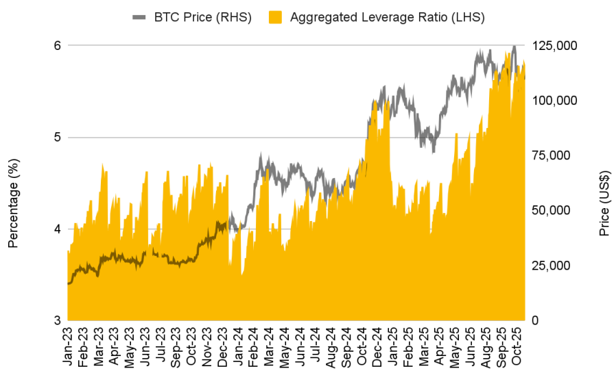 10월 10–11일의 급격한 조정에도 불구하고, 온체인·오프체인을 합친 총 레버리지 비율은 잠시 5% 아래로 내려갔다가 10월 31일 5.77%까지 10% 이상 급반등해, 8월의 고조된 수준으로 복귀했습니다. 가격 반등과 결합해 보면, 이는 투기 심리가 강하고 10월 11일의 급락이 지속적 디레버리징이나 신뢰 상실로 이어지지 않았음을 시사합니다.