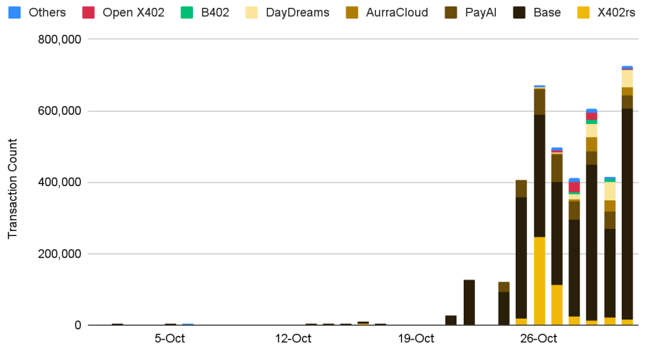 출시(5월) 이후 한동안 사용량은 제한적이었으나, 10월 거래량이 수백 건에서 수십만 건으로 급증했습니다. 10월 마지막 날 일일 트랜잭션 72만 건, 주간 370만 건 이상을 기록했습니다. 성장은 Base에서 시작되어 BNB 체인·Solana 로 확산됐습니다. 촉매는 단일 웹 요청으로 자산을 민팅·매수하게 해준 토큰 런치 물결이었고, 이는 새로운 온체인 실험을 촉발했습니다.