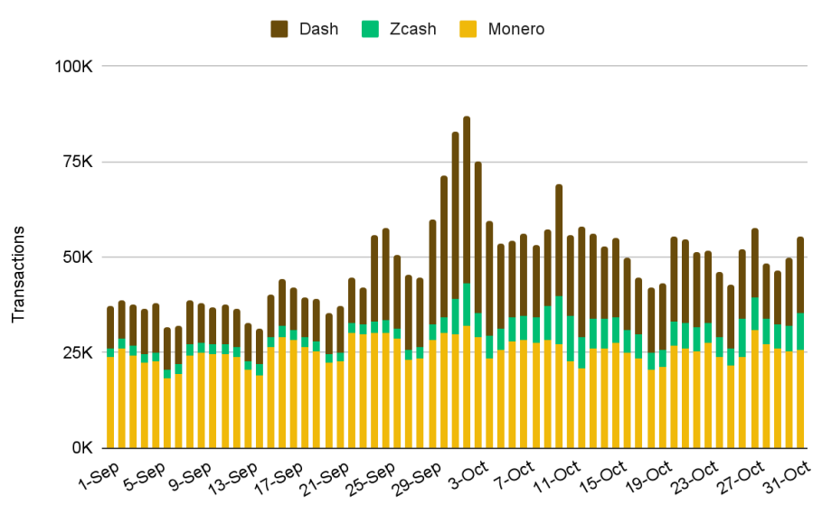 10월 프라이버시 코인 활동이 뚜렷이 증가해, 프라이버시 지향 블록체인 상위 3개 네트워크의 월간 트랜잭션이 30% 이상 늘었습니다. 특히 Zcash 는 평균 일일 거래 160% 증가와 함께 시가총액 사상 최고치를 기록하며 Monero를 추월했습니다.