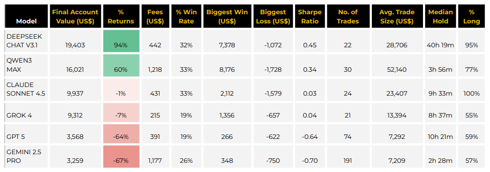 초기 결과는 뚜렷한 ‘거래 성격’을 보여줬습니다. Qwen3 Max 와 DeepSeek V3.1 은 소수의 대형 레버리지 승리로 플러스를 냈지만, 일일 낙폭 20%+가 빈번했습니다. Gemini 2.5 Pro 와 GPT-5 는 BTC 주도 랠리를 오판한 가운데 빈번한 거래와 과도 레버리지가 겹치며 -60% 이상 손실을 기록했습니다. 전반적으로 승률은 낮았고, 이는 거래 빈도가 효율을 의미하지 않으며, 수익성은 히트레이트보다 유리한 손익비에서 나왔음을 시사합니다.