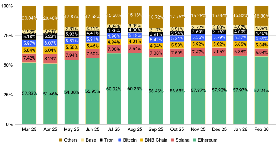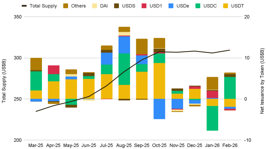 스테이블코인 공급량은 2월에도 3,150억 달러로 견조하게 유지됐으며, 전월 대비 3% 증가했습니다. 이는 크립토 시장 전반의 리스크 오프 상황이 지속됐음에도 사이클 고점 부근 수준을 유지한 것입니다. 공급 축소가 나타나지 않았다는 점은 자본이 생태계 밖으로 이탈하기보다 안전자산 성격의 스테이블코인으로 이동했음을 시사합니다.