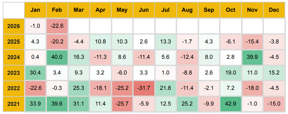- DOGE는 X의 스마트 캐시태그(Smart Cashtags) 발표 기대감으로 2월 14일 하루 14% 급등했음에도 불구하고, 월간 기준으로는 22.7% 하락했습니다.
