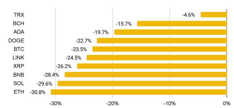 비트코인 도미넌스는 57.9%로 전월 대비 1% 소폭 하락했습니다. 이더리움 도미넌스는 2% 하락한 10.8%를 기록했으며, 월간 가격 수익률이 더 부진해지면서 유동성 경색 국면에서 메이저 코인들의 점유율도 약세를 보였습니다.