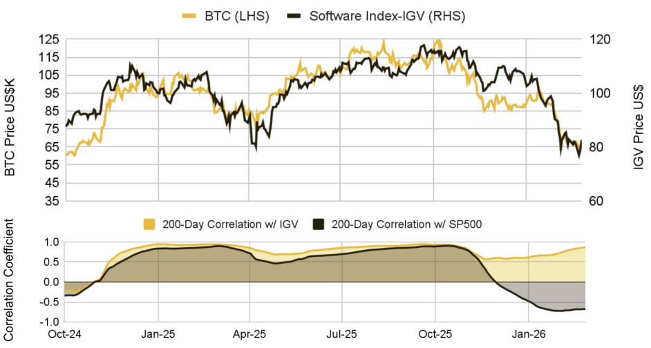 이 배경에는 BlackRock, Fidelity 같은 전통 자산운용 대형 플레이어의 대규모 유입으로 BTC 보유 구조 자체가 바뀌었다는 점이 있습니다. 기술주 포트폴리오와 BTC ETF를 동시에 보유한 기관투자자들이 현재 시장의 지배적인 세력이 됐습니다. 이들의 퀀트 리스크 모델이 소프트웨어 섹터의 구조적 하락에 직면하면, BTC는 동일한 리스크 팩터 체계 안에서 취급됩니다. 소프트웨어 주가 하락이 계속되면 포트폴리오 차원의 리스크 축소가 촉발되고, BTC는 유동성이 높은 위험자산인 만큼 기관 디레버리징 과정에서 우선 청산 대상이 됩니다.