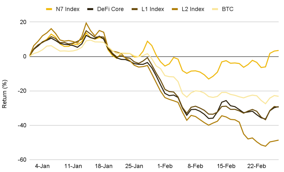 NeoFi 프로토콜을 동일 비중으로 구성한 N7 지수는 연초 이후 +3.5% 수익률을 기록하며, 2026년 들어 플러스 수익 구간에 있는 몇 안 되는 영역 중 하나가 됐습니다. BTC와 DeFi Core Index 대비 각각 약 27%, 33% 초과 성과를 냈습니다. 이 바스켓은 1월 중순 +13.7%까지 상승한 뒤 2월 매도세 속에서 -13.1%까지 조정받았지만, 2주 만에 회복했습니다. 이는 다른 영역에서는 보기 어려운 복원력 패턴입니다. 시장이 DeFi 섹터를 하나의 통합된 트레이드로 보기보다, 개별 프로토콜의 펀더멘털에 따라 차별화하기 시작했음을 시사합니다.